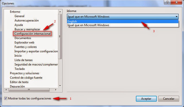 Marcamos la casilla Mostrar todas las configuraciones, en Configuración Internacional / International Settings seleccionamos el idioma que nos aparece en el combo.