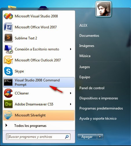 Cerramos MS. Visual Studio 2008 y aperturamos Visual Studio 2008 Command Prompt.