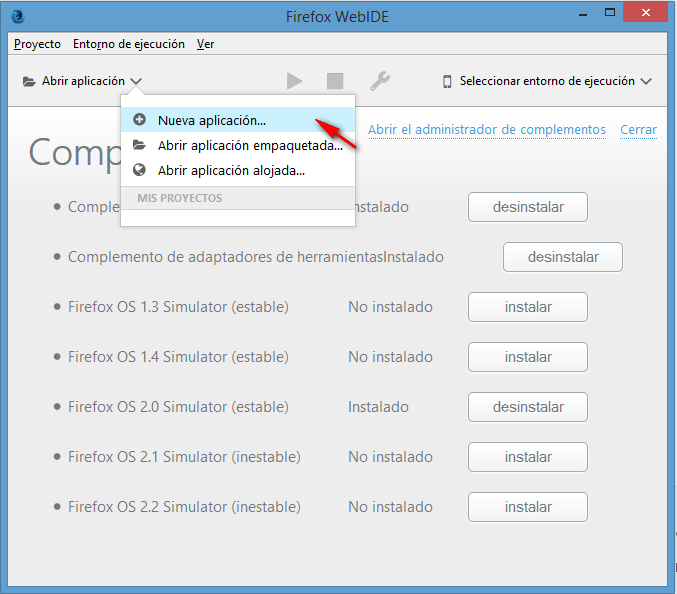 Una vez terminada la instalación del simulador voy a crear una nueva aplicación para Firefox OS 2.0.
