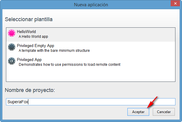 Seleccione la plantilla HelloWord y escriba como se llamara su nuevo proyecto, luego presione sobre el boton [Aceptar].